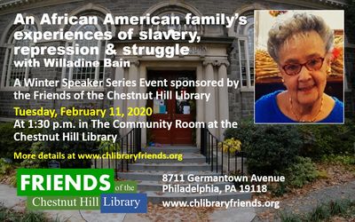 For Black History Month, hear stories told by WilladineBain about her great grandmother and grandparents, her ex-slave grandfather who became a Savannah millionaire, her grandmother’s first husband who died in a duel, and about the precious gold necklace. Mrs. Bain, author of the “THE GOLD NECKLACE,” is a Howard graduate. She retired from the School District of Philadelphia as Assistant Director of Curriculum. .